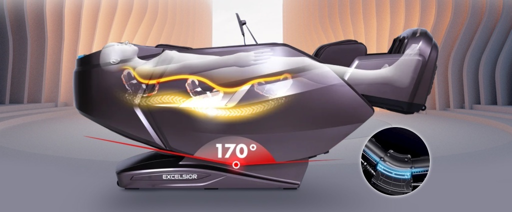 Максимальный угол наклона в кресле EXCELSIOR 170° достигается за счёт уникального гибкого SL-трека I-OPEN. 2 направляющие с регулировкой угла наклона обеспечивают полное расслабление позвоночника и наиболее удобное положение тела при массаже, усиливая его эффективность.